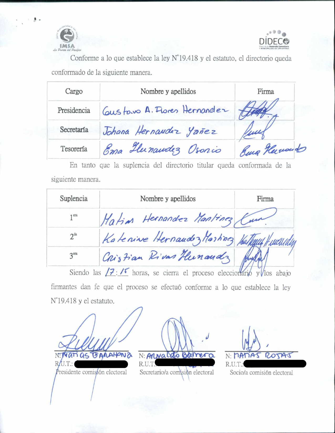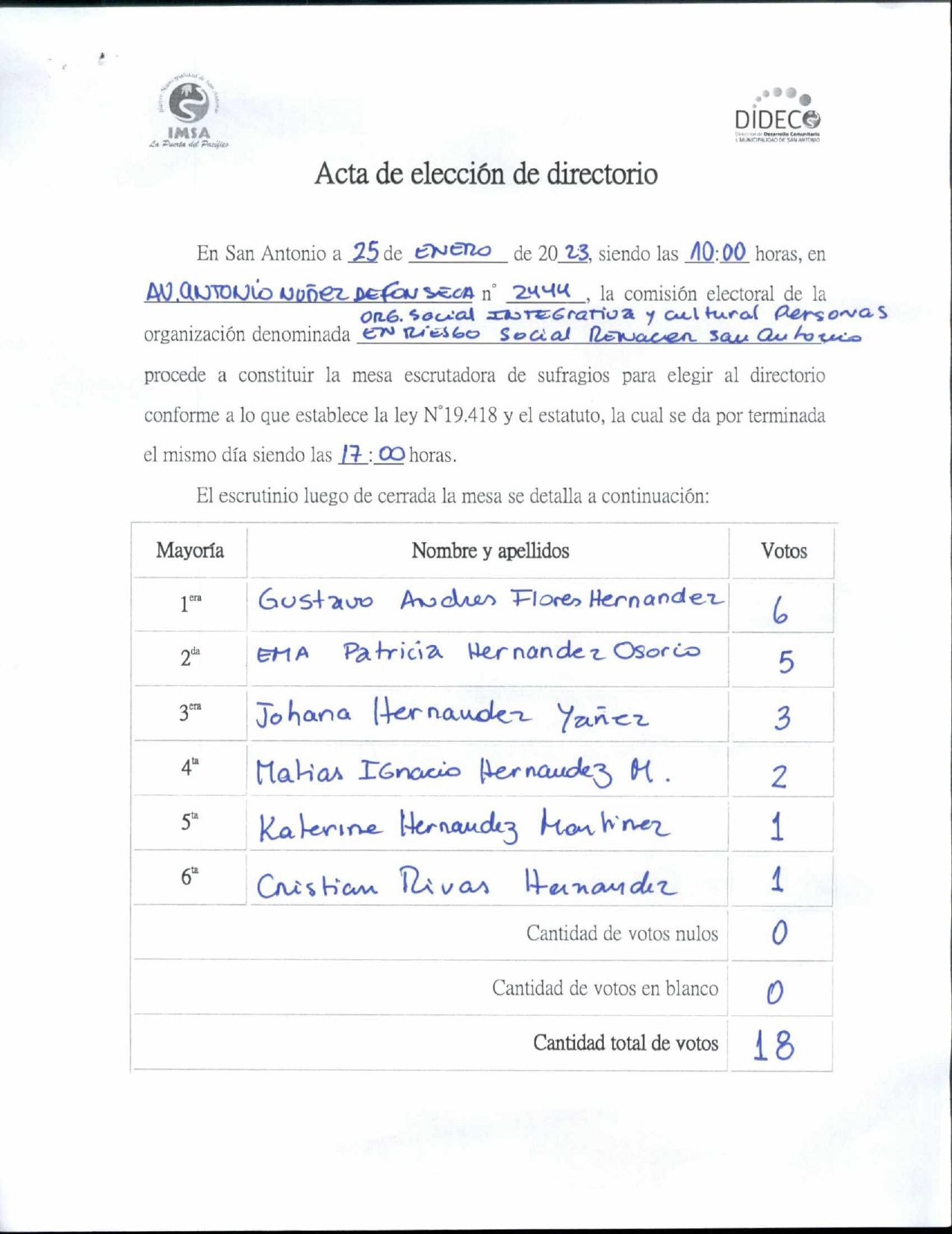 Acta de elecciones "ACTA ORGANIZACION SOCIAL INTEGRATIVA Y CULTURAL PERSONAS EN RIESGO SOCIAL RENACER SAN ANTONIO"