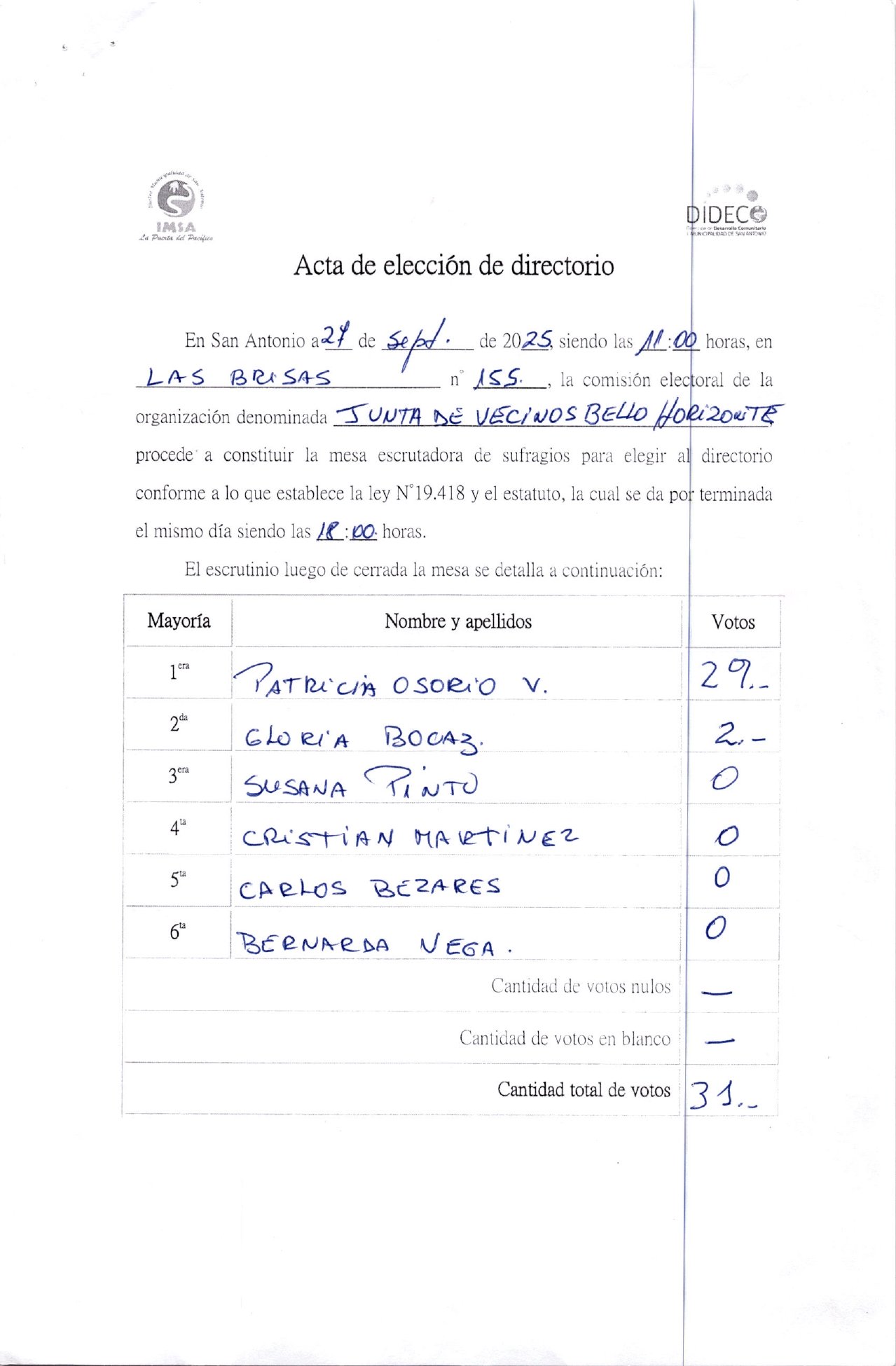 Acta de elecciones JJVV BELLO HORIZONTE
