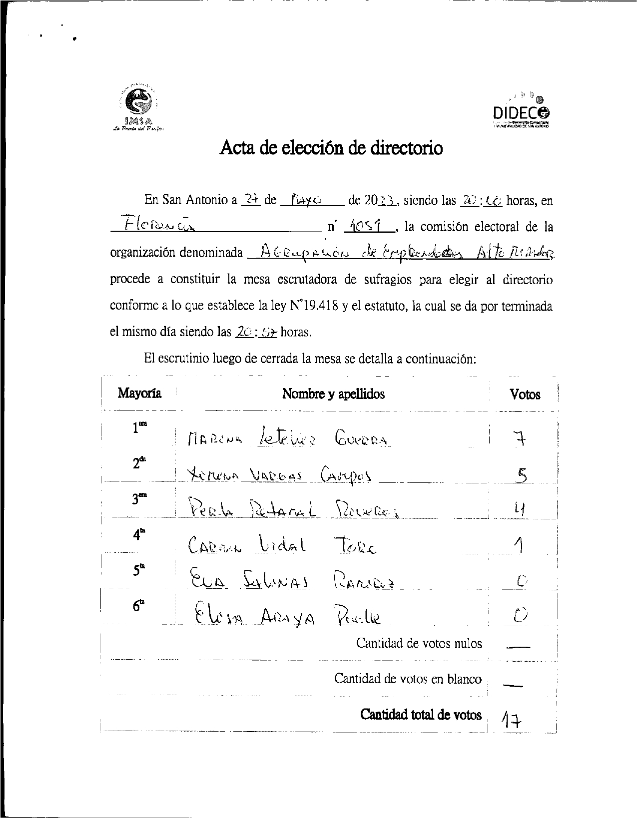 Acta de elecciones "Agrupación de emprendedores Alto Mirador"