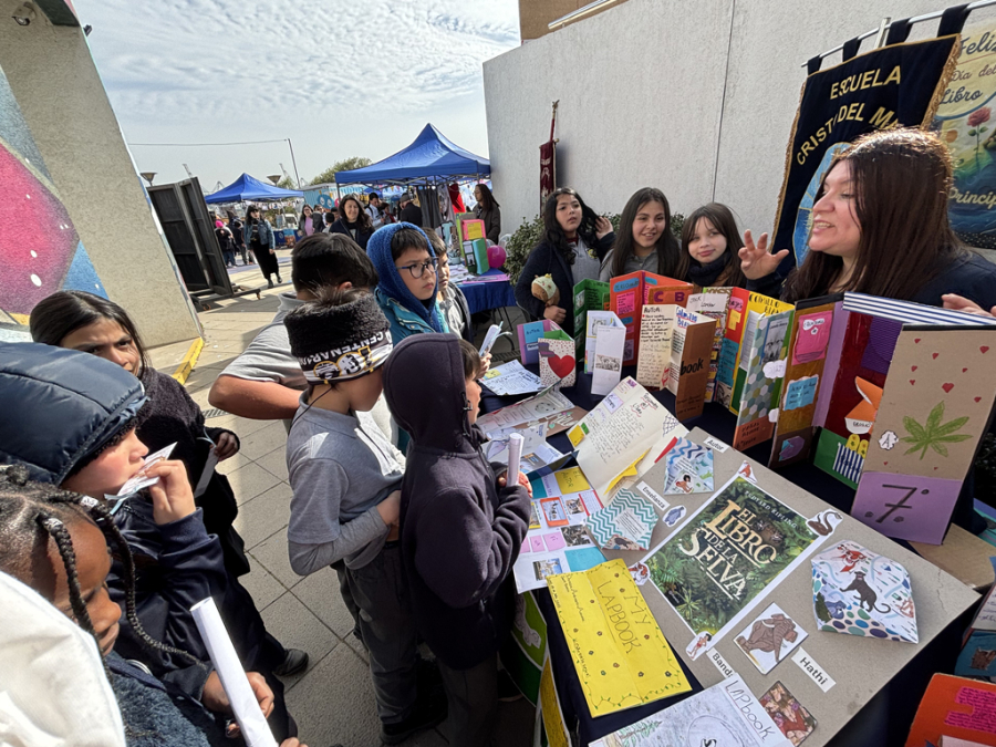 En el stand de la escuela Presidente Pedro Aguirre Cerda (ex Grupo Escolar), la profesora Paula Fernández acompañada por alumnas de octavo básico ofrecieron hablar sobre el libro que eligieran los visitantes, de los que tenían en su mesa decorada con imágenes de diferentes personajes de historias y cuentos.